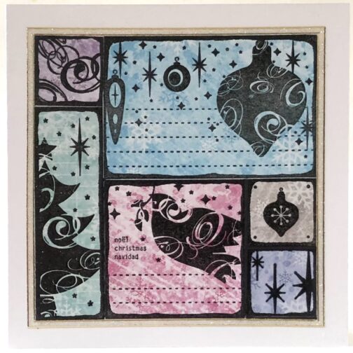 This Christmas card is created from a patchwork design of Christmas images – tree, baubles and a dove. Four squares and two rectangles are united to make one large square which is framed by a gold glittery border. The design is raised off the backing card by 3D pads so it sits proud.The images are handpainted in pink and green. The card is blank inside for your own Christmas greetings.